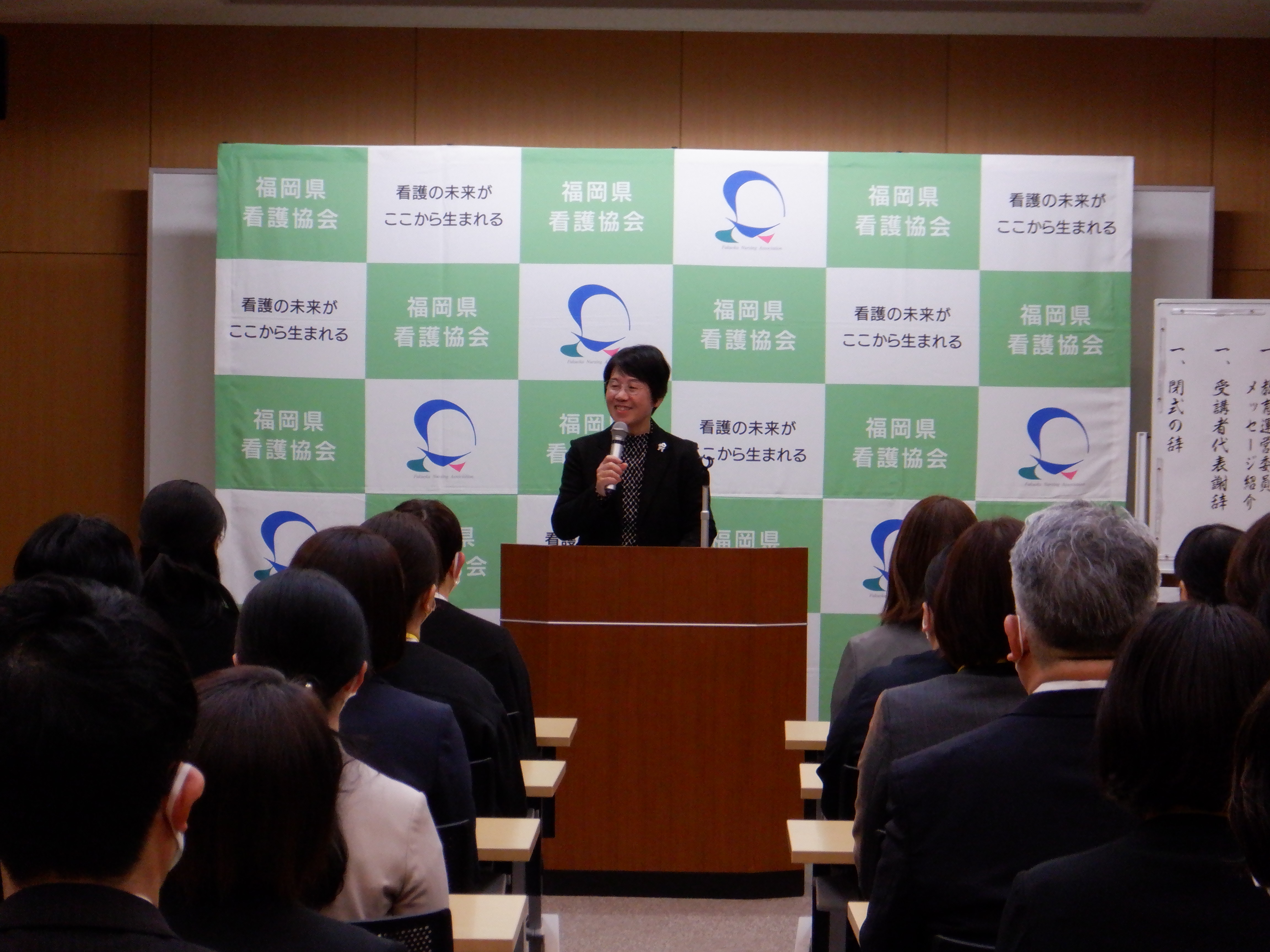そのあとの閉講式では、受講者はやり遂げた達成感に包まれ、すがすがしさに満ちあふれていました。受講者代表の謝辞では、セカンドレベルでの出会いへの感謝と、築いた繋がりを今後も大切にしていく思いが語られました。さらに、ここで得た学びを組織や現場に持ち帰り、看護の質向上と人材育成に一層励み、今後の看護界の発展に貢献していきたいと強い決意が述べられました。