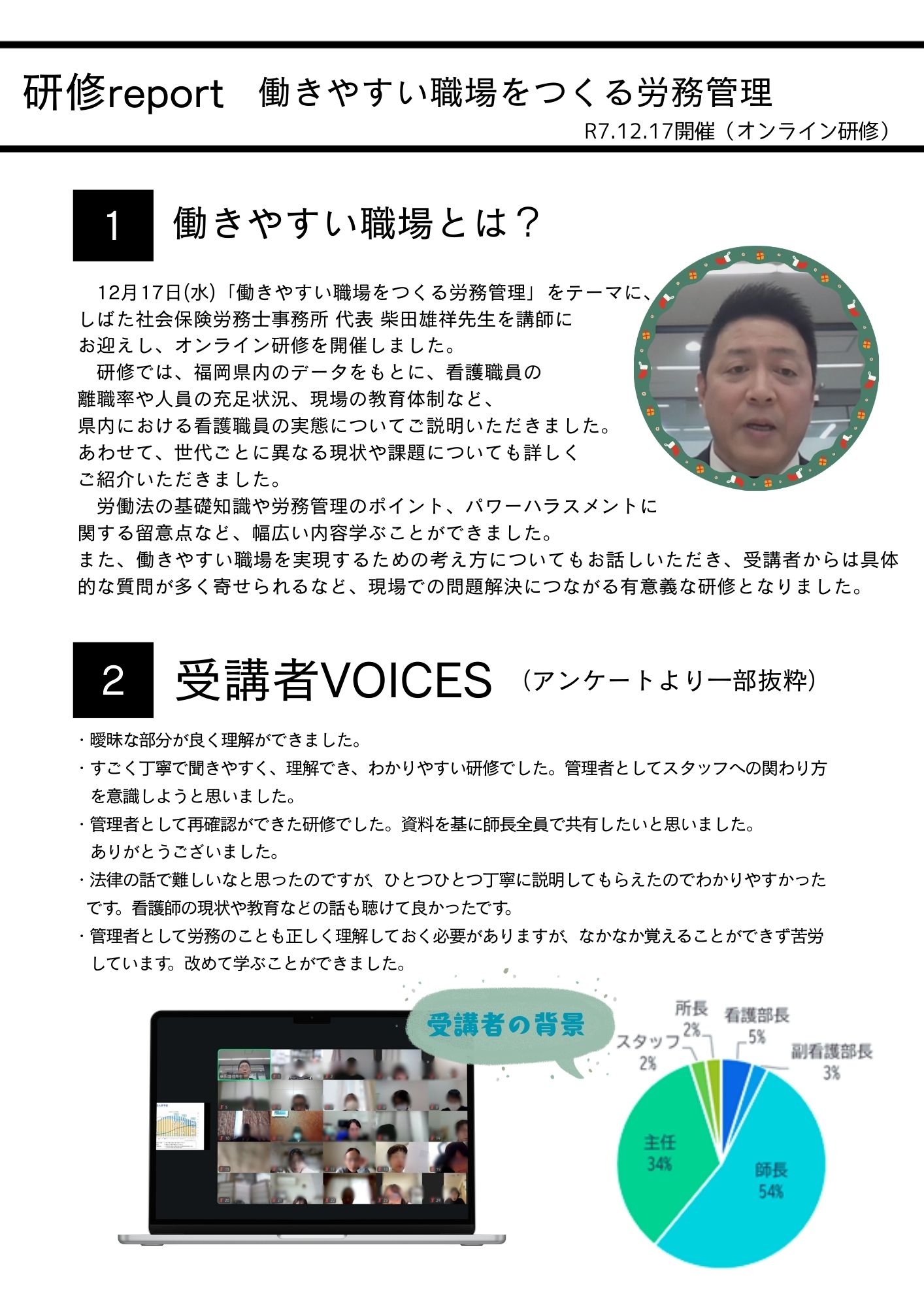 12月17日(水)「働きやすい職場をつくる労務管理」のオンライン研修を開催いたしました。