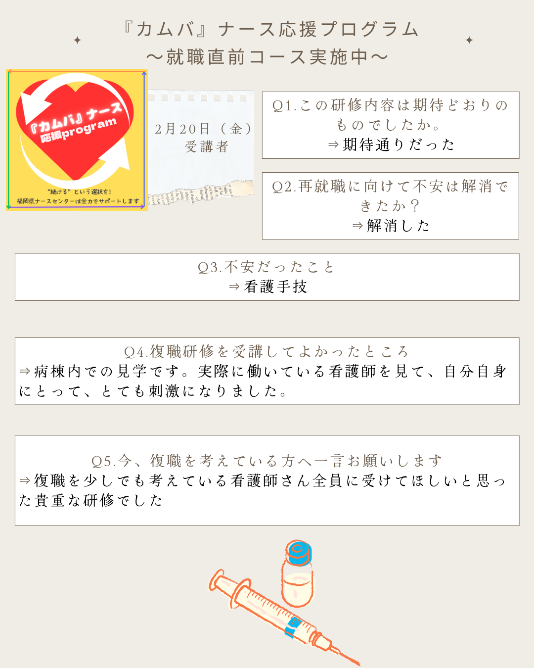 福岡県ナースセンターでは、福岡県からの委託を受け、看護の仕事に復職したい方が安心して職場復帰していただけるためのセミナーを開催しています。