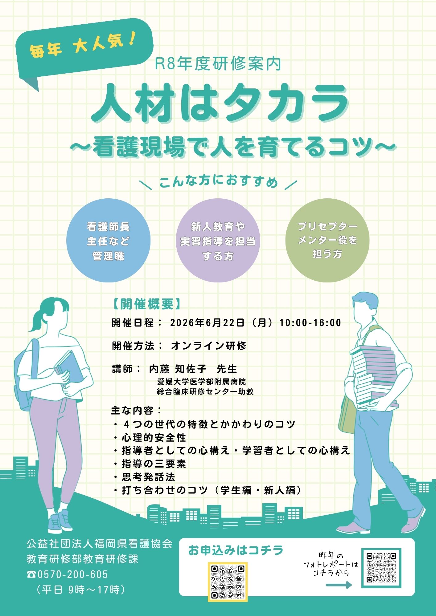 昨年ご好評をいただいた愛媛大学医学部附属病院の内藤知佐子先生をお迎えし、今年も【人材はタカラ ~看護現場で人を育てるコツ~】を開催します