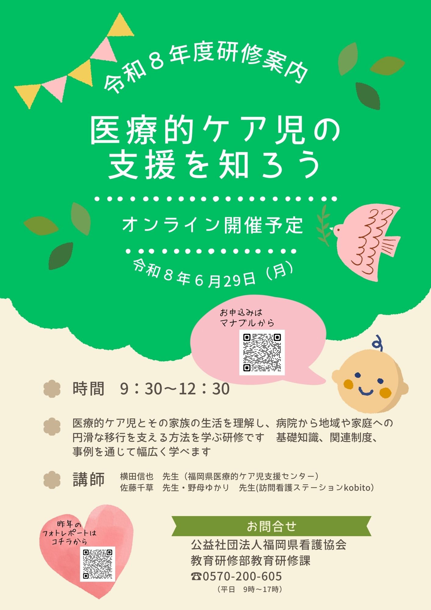 医療的ケア児とその家族の生活を理解し、病院から地域や家庭への円滑な移行を支 える方法を学ぶ研修です
