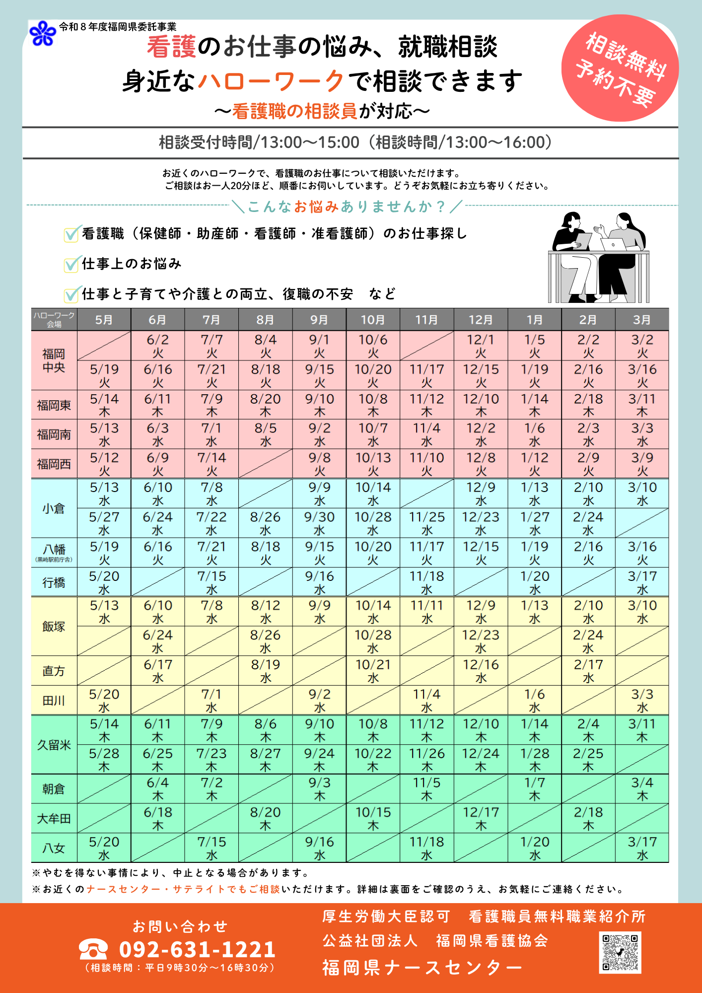 福岡県内の14ヶ所のハローワークで、看護職のご相談を就労相談支援員がお受けしています。