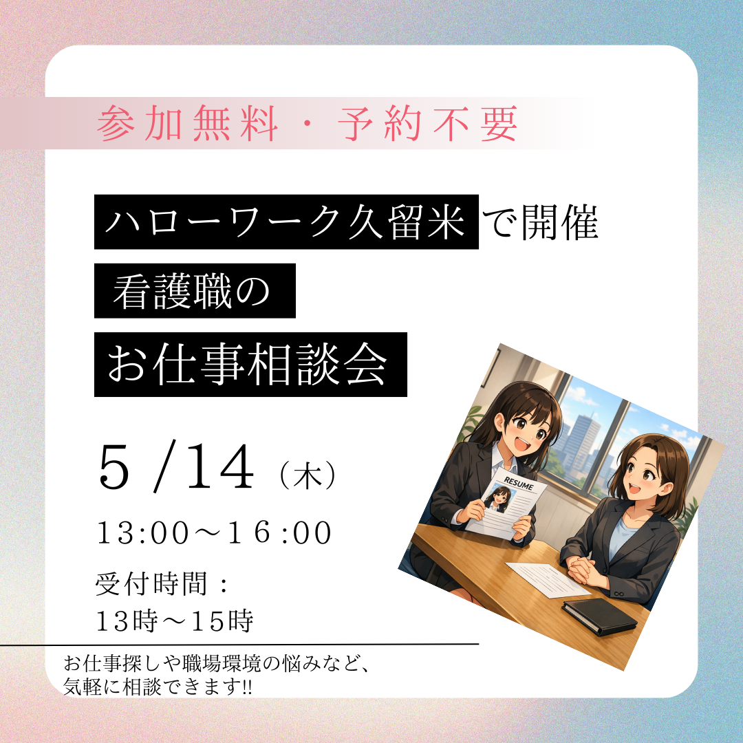 5/14(木)ハローワーク久留米にて看護職のお仕事相談を実施します