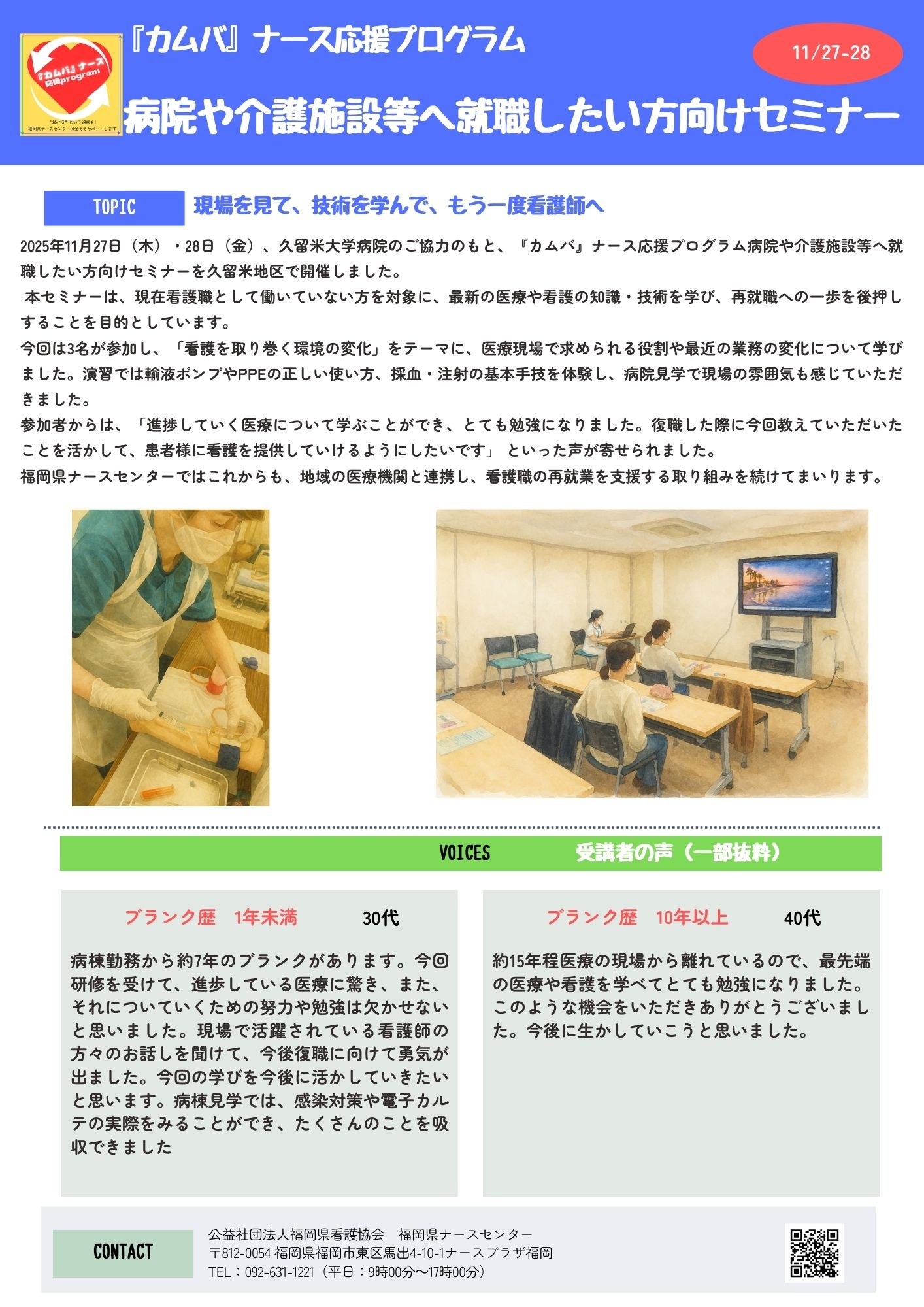 2025年11月27日(木)・28日(金)、久留米大学病院のご協力のもと、病院や介護施設等へ就職したい方向けセミナーを久留米地区で開催しました。