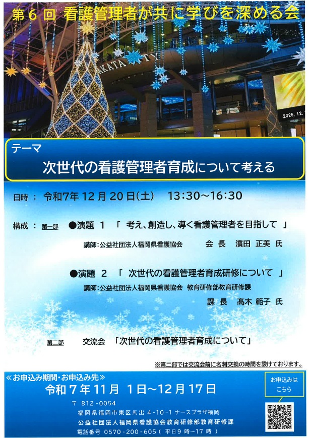 【12/20開催】次世代の看護管理者育成について共に考えましょう!~第6回看護管理者が共に学びを深める会~(申込期間:11/1~12/17)