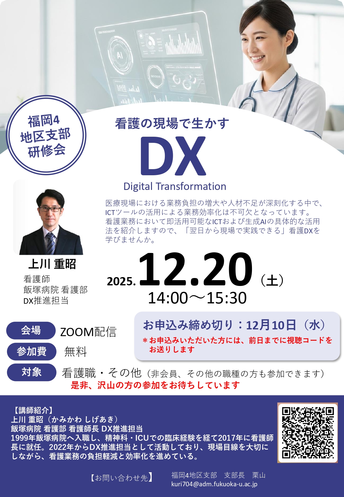 【4地区支部】地区支部研修会 「看護の現場で生かすDX」研修会のお知らせ ※参加費無料NEW!